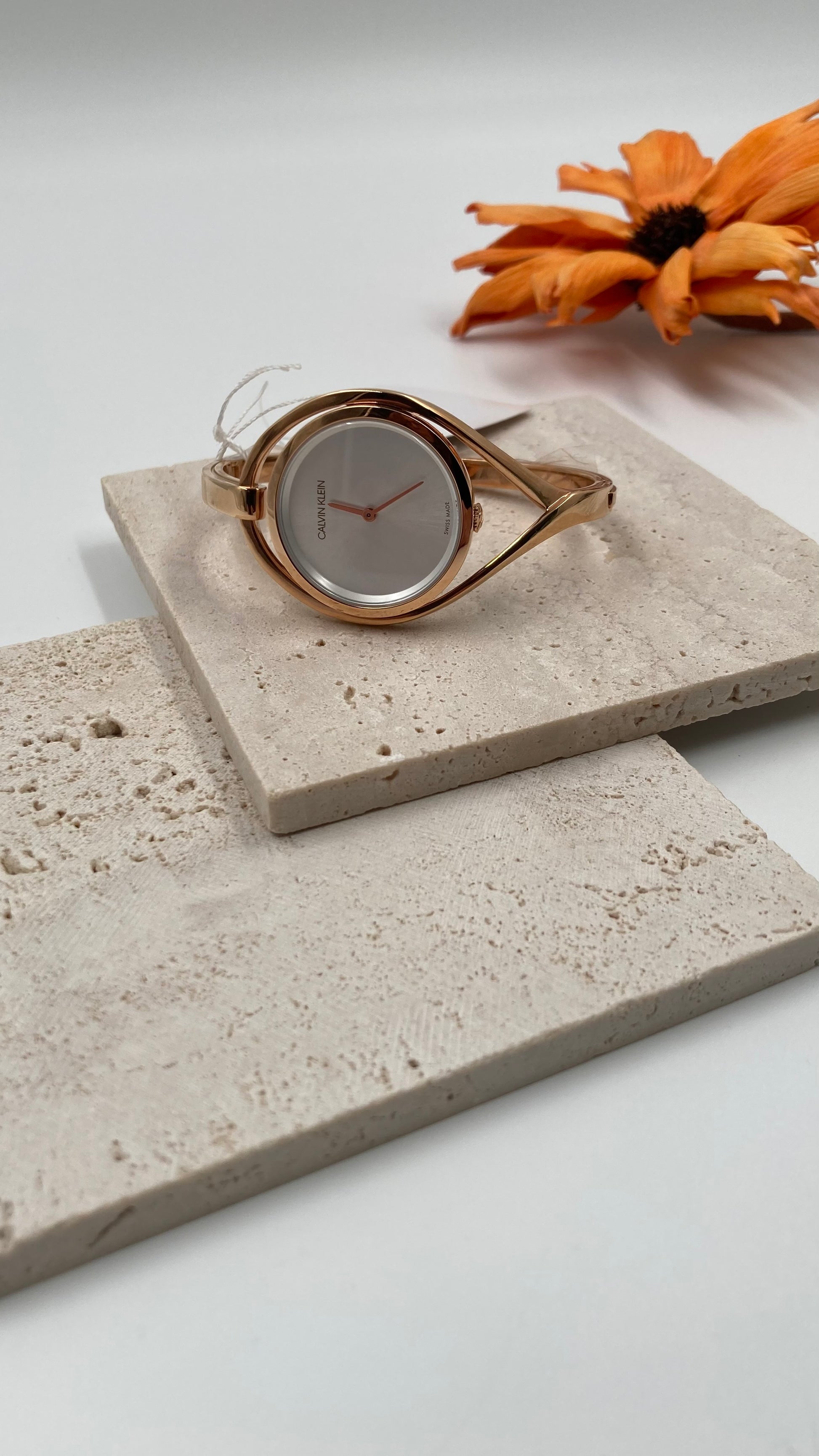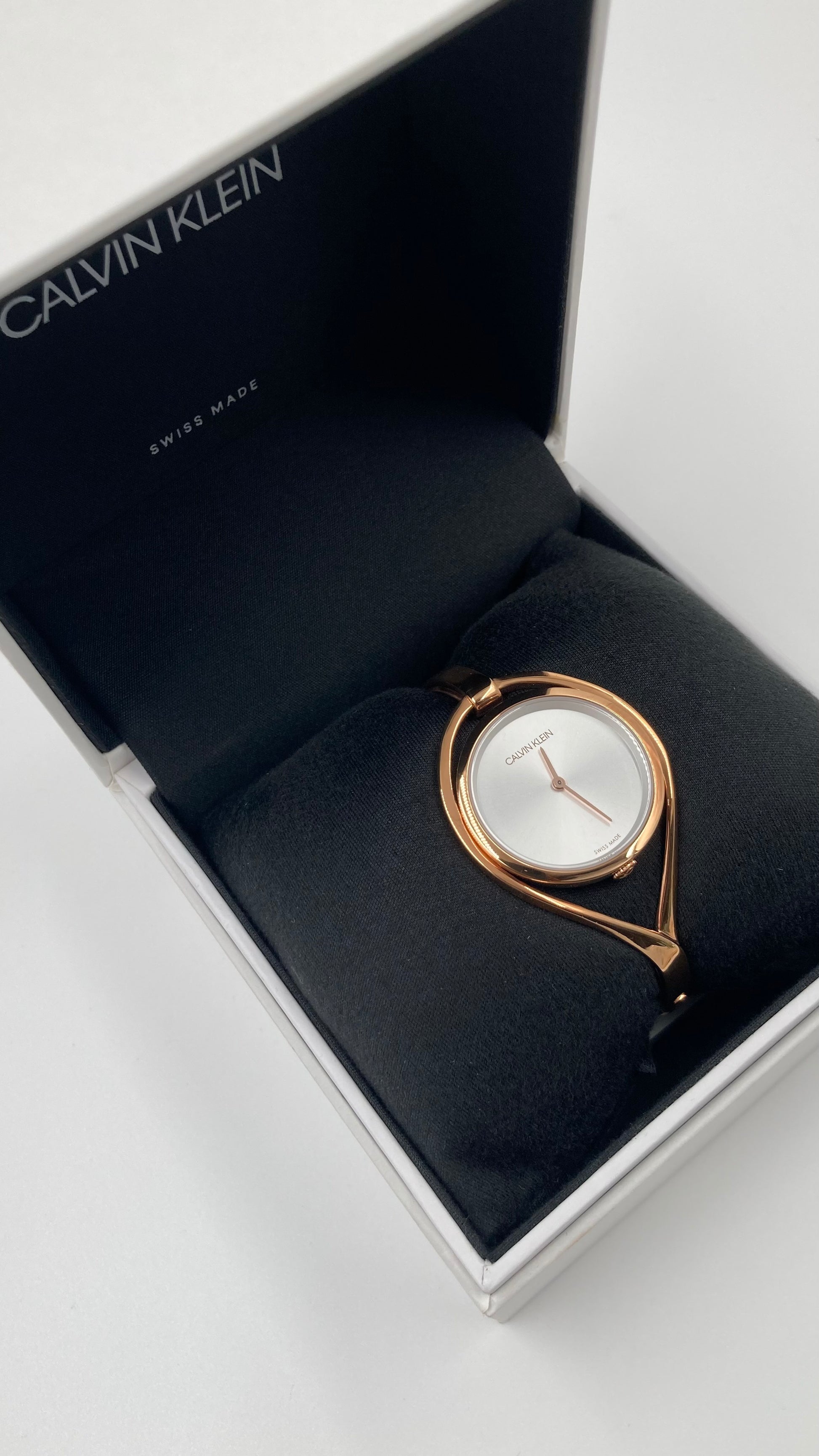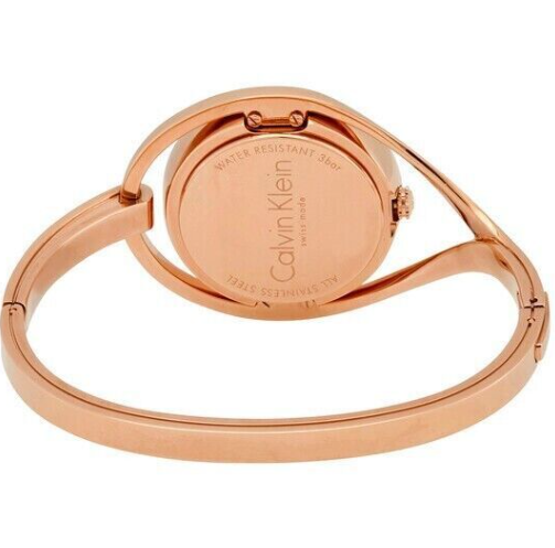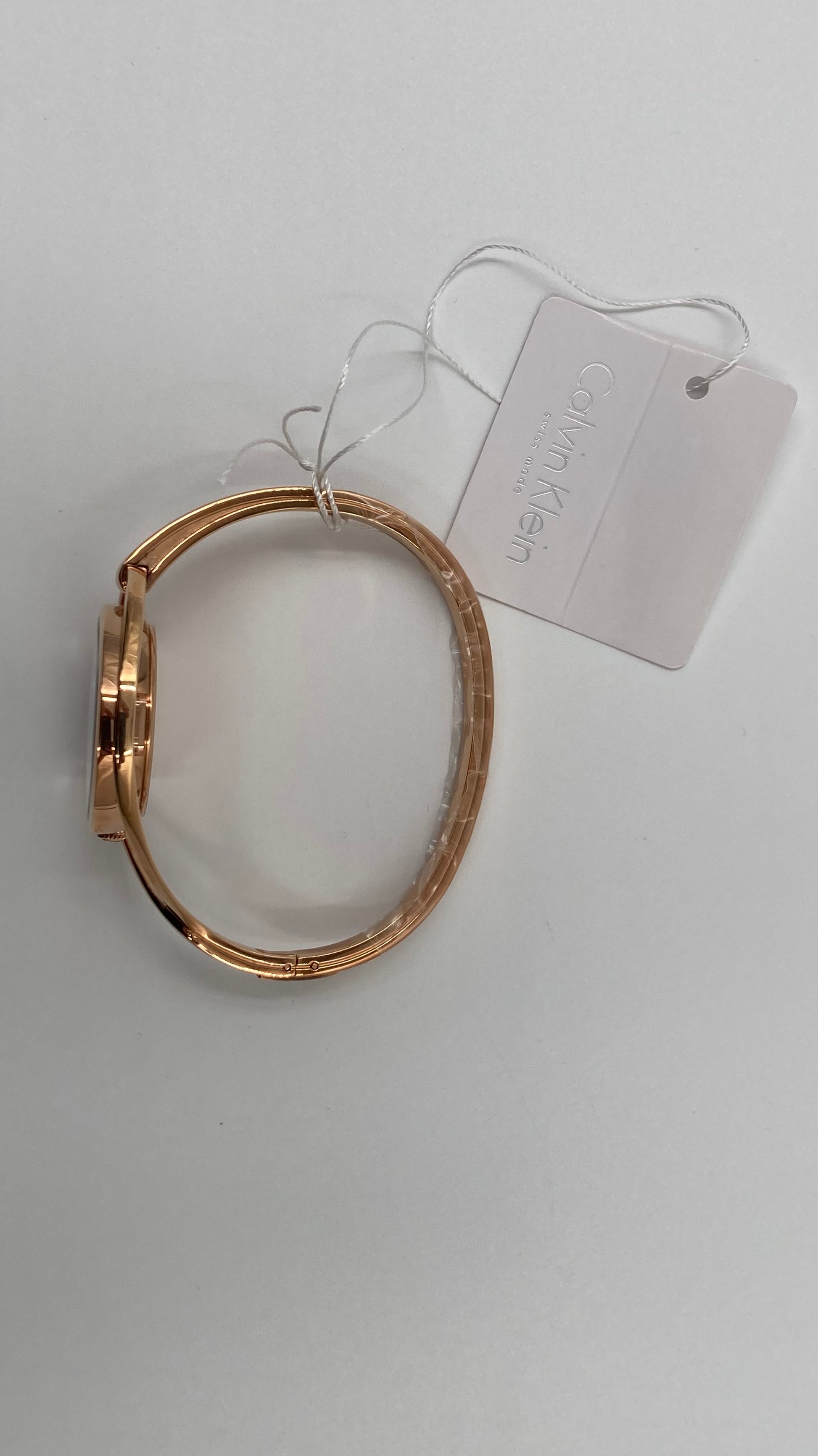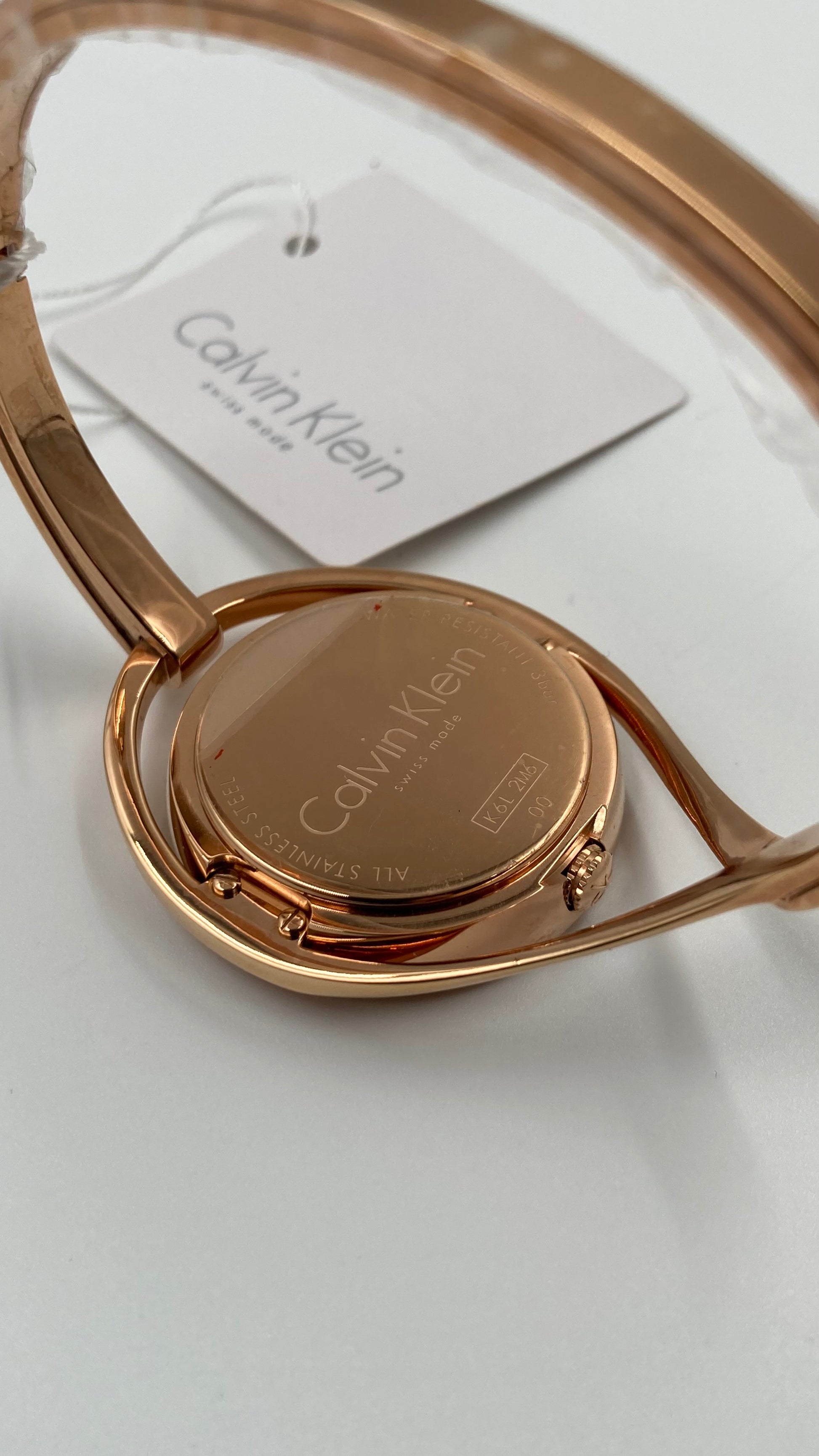 Rose gold PVD stainless steel case with a rose gold PVD stainless steel bangle bracelet. Fixed rose gold PVD bezel. Silver dial with rose gold-tone hands. No markers. Dial Type: Analog. ETA 802.002 quartz movement. Scratch resistant mineral glass. Pull/push crown. Solid case back. Round case shape. Case size: 29mm. Case thickness: 7mm. Jewellery clasp. Water resistant at 30 meters / 100 feet. Functions: hour, minute. Casual watch style. Watch label: Swiss Made. K6L2M616. MEASUREMENTS - Bracelet Inner Width: 5.6 cm. Bracelet Inner Height: 4.3 cm. Inner Circumference: 15.5 cm. . Item comes in original Calvin Klein box. Please check measurements for the correct size when ordering. MADE IN SWITZERLAND.