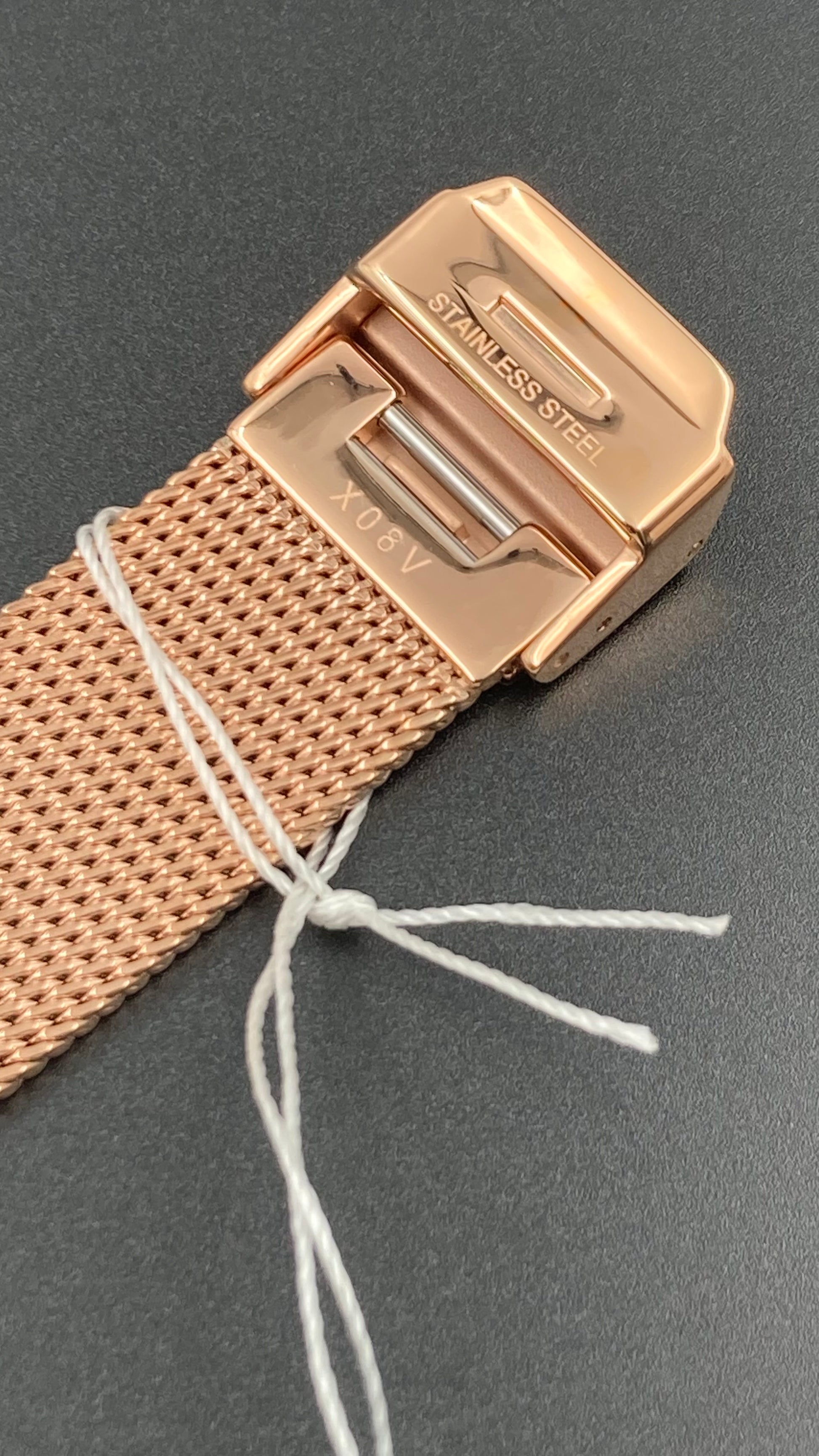 Die Uhr verfügt über ein poliertes Roségold-PVD-Edelstahlgehäuse und ein Mesh-Armband. Das schwarze Zifferblatt verfügt über roségoldfarbene Zeiger und Indexe und ist durch kratzfestes Mineralglas geschützt. Mit einer schlanken, runden Gehäuseform und einer schlanken Dicke von 7 mm ist diese Uhr leicht und bequem am Handgelenk.