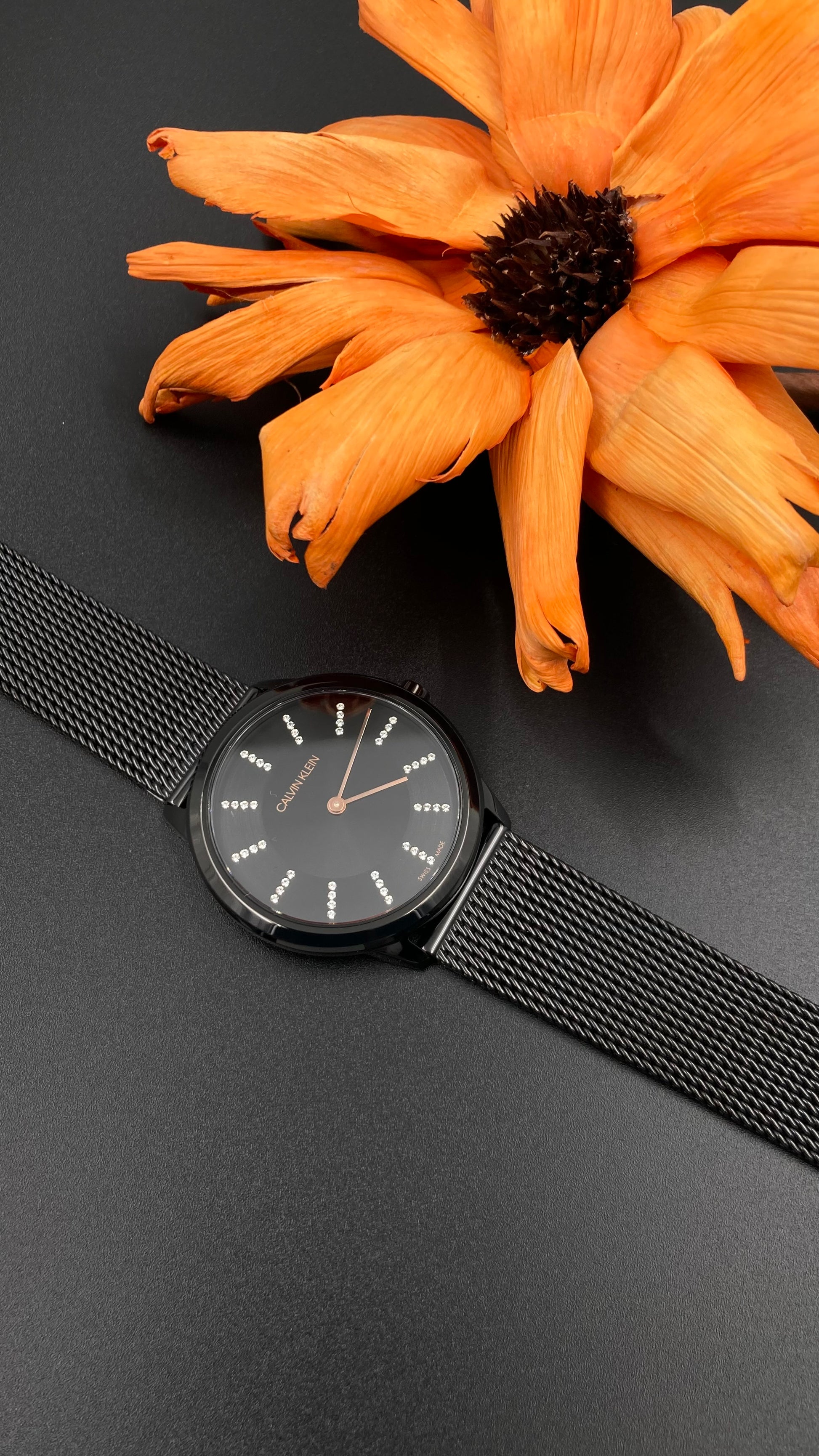 Schwarz beschichtetes Edelstahlgehäuse mit schwarz beschichtetem Edelstahl-Mesh-Armband. Feste schwarz beschichtete Lünette. Schwarzes Zifferblatt mit roségoldfarbenen Zeigern und Stundenmarkierungen aus Kristallglas. Zifferblatttyp: Analog. Quarzwerk. Kratzfestes Saphirglas. Krone zum Ziehen/Drücken. Massiver Gehäuseboden. Runde Gehäuseform. Gehäusegröße: 35 mm. Bandbreite: 18 mm. Durchsteckschließe mit Faltschließe. Wasserdicht bis 30 Meter/100 Fuß. Funktionen: Stunde, Minute. Eleganter Uhrenstil. Uhrenlabel: Swiss Made. Calvin Klein Quarzuhr mit schwarzem Zifferblatt für Damen K3M22X2X