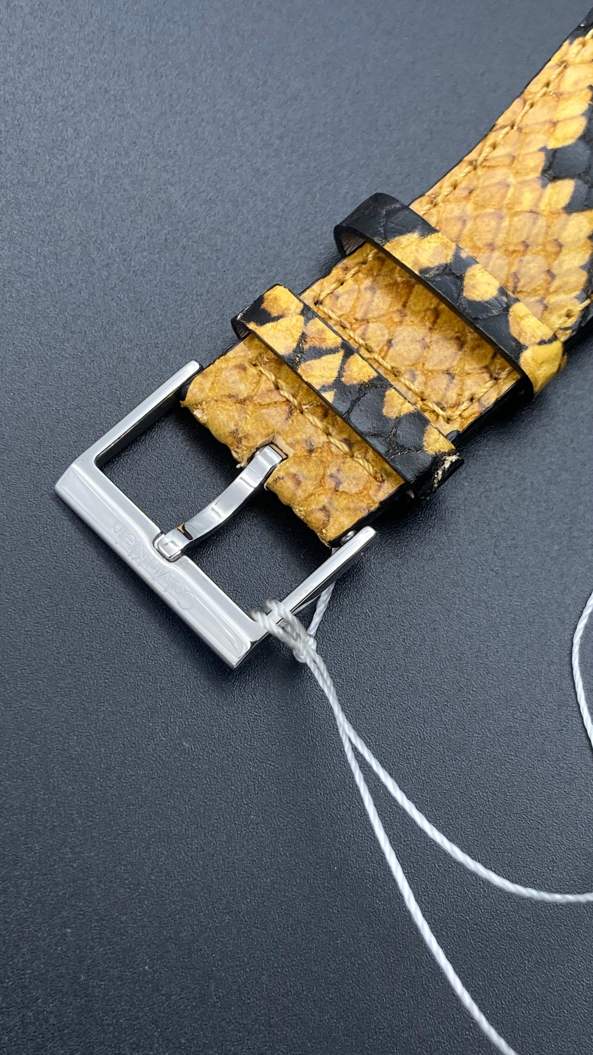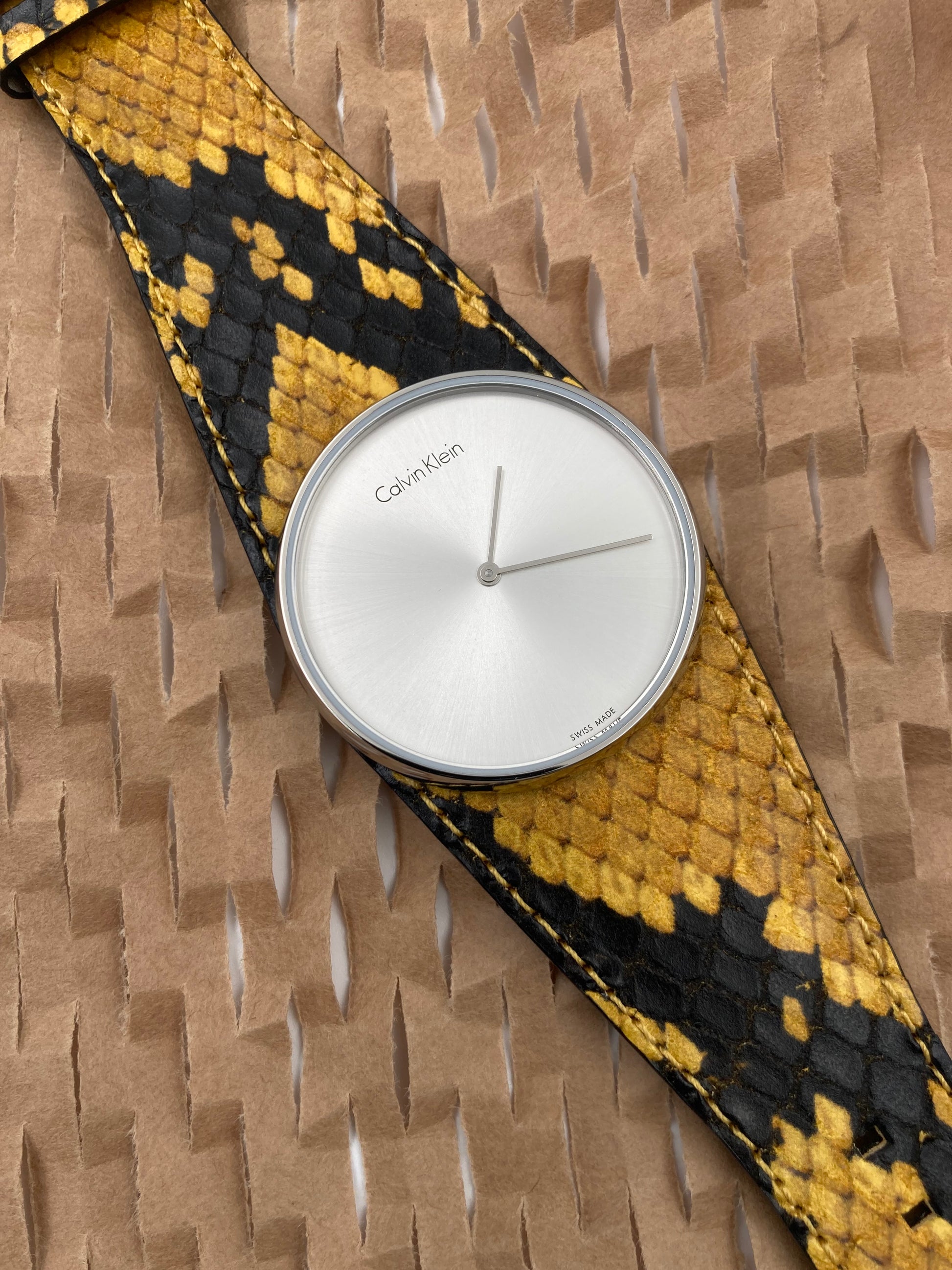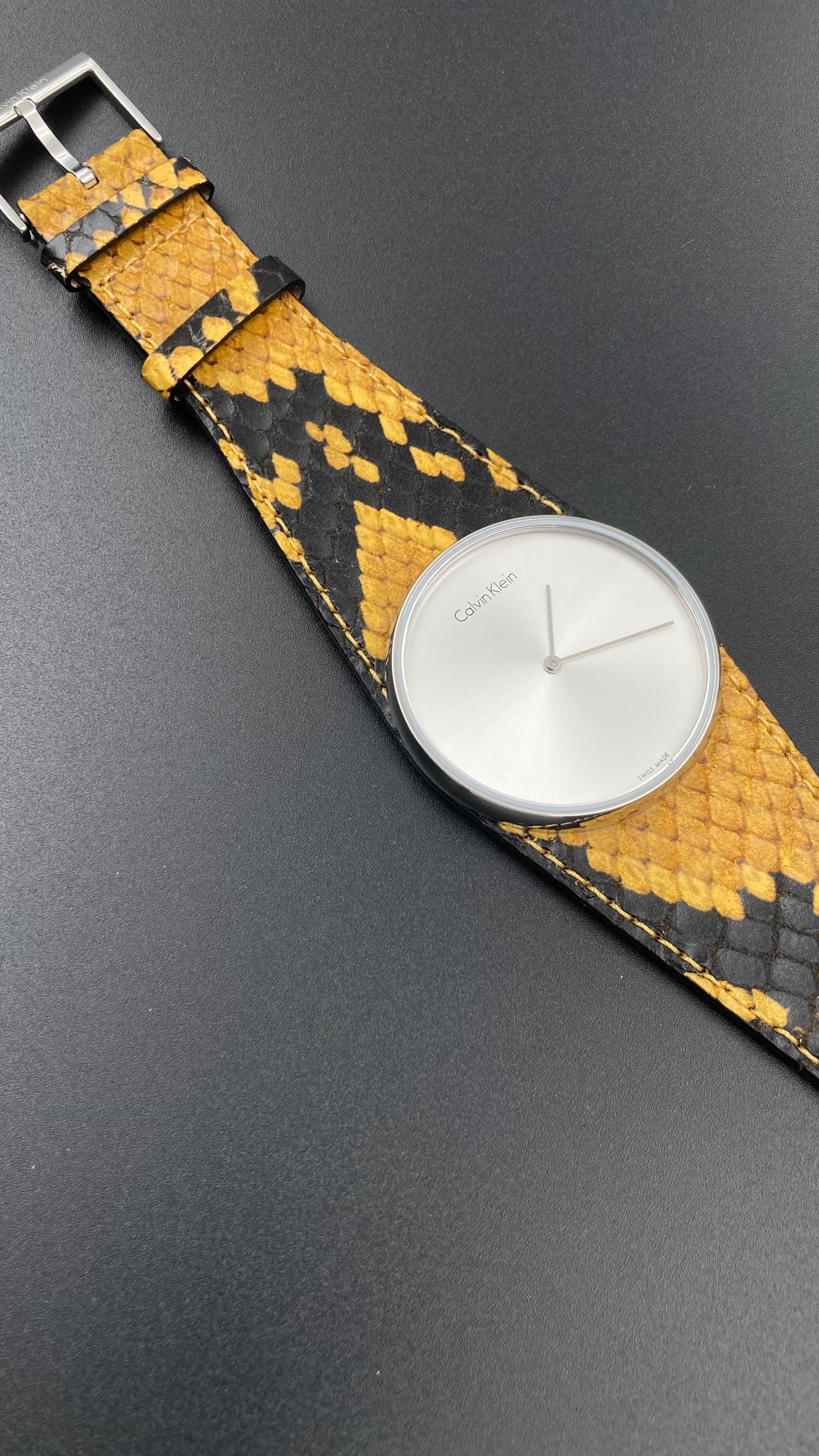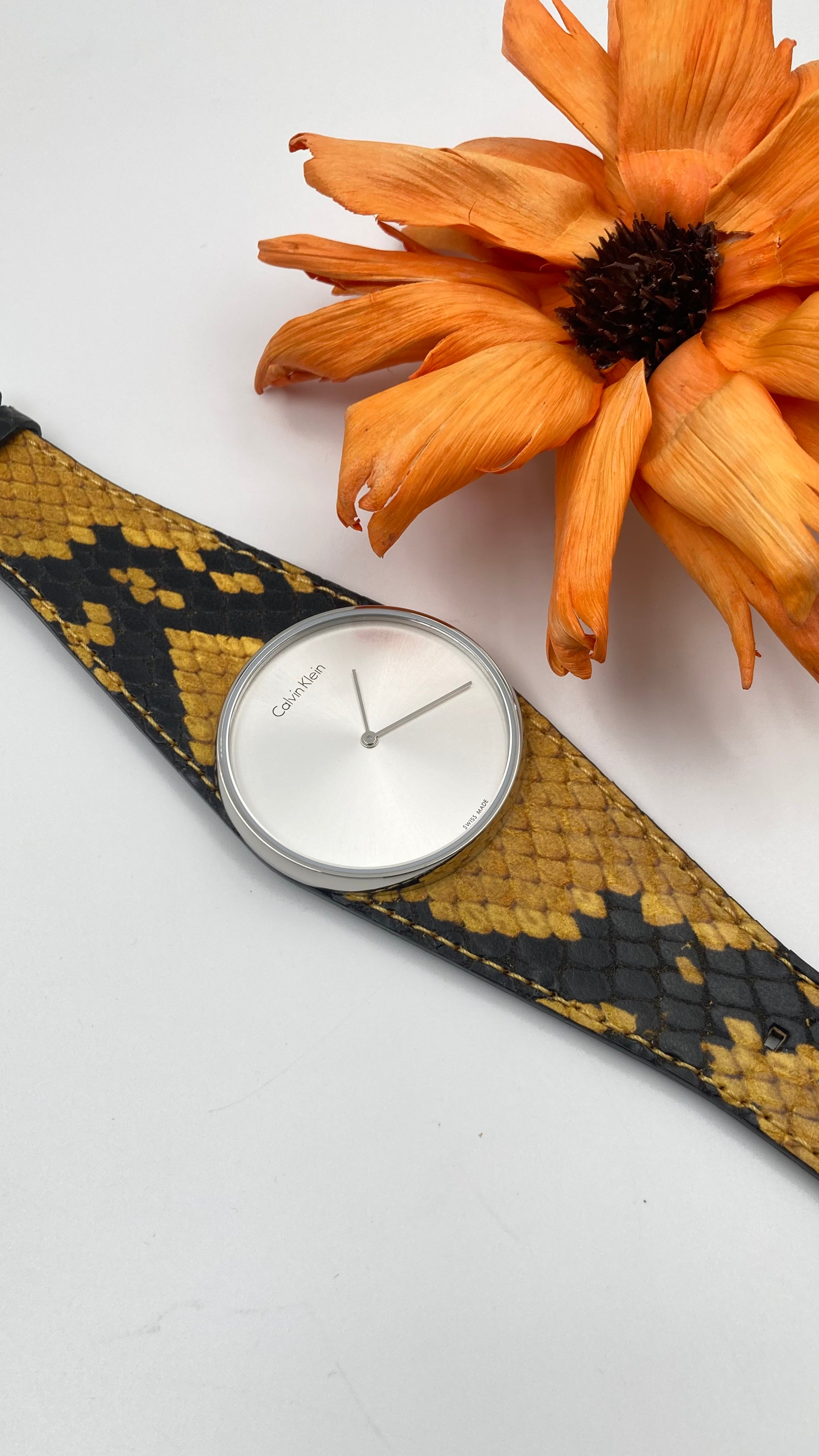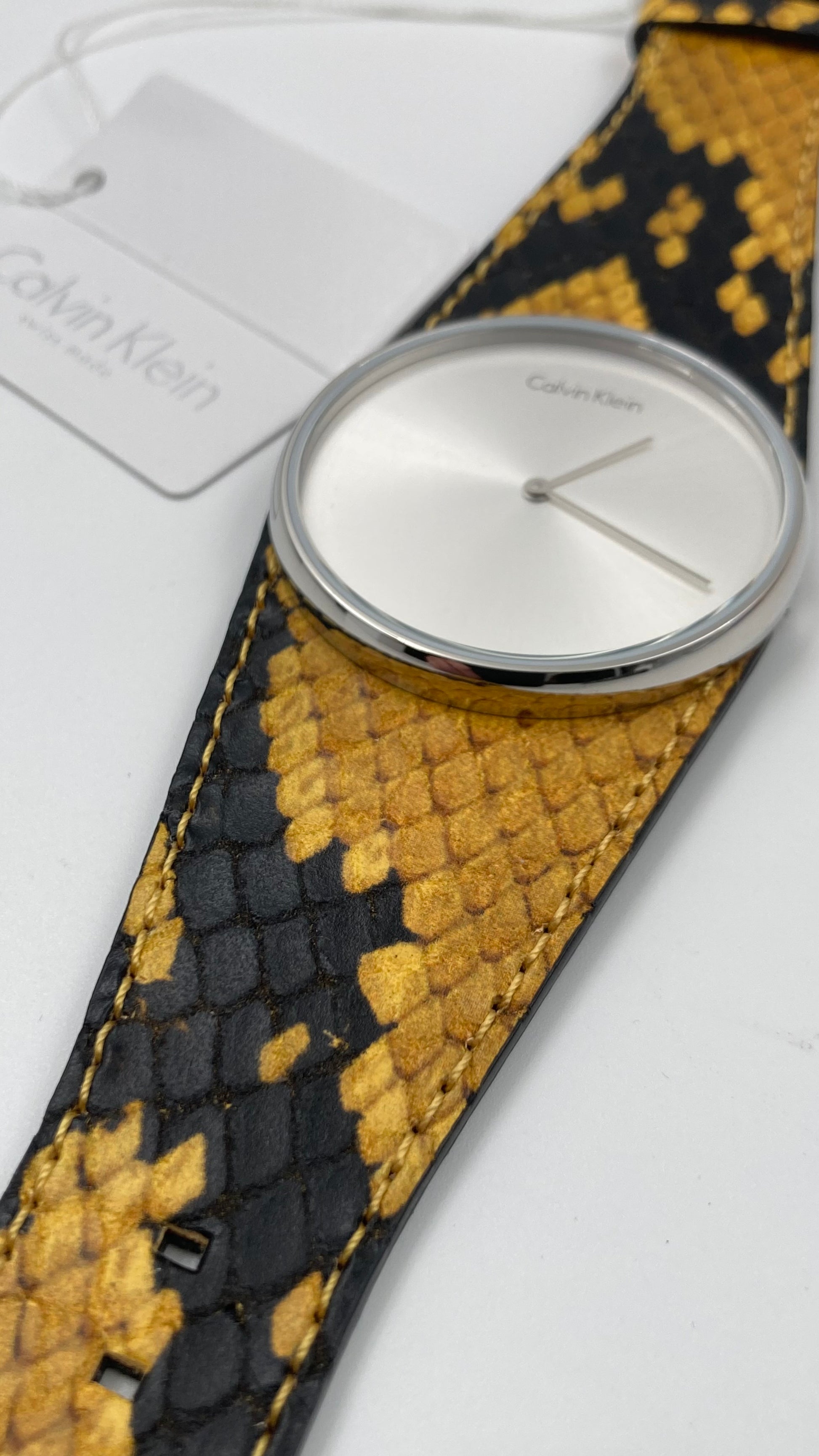 Edelstahlgehäuse mit gelbem und schwarzem Lederarmband (Pythonmuster). Feste Edelstahllünette. Silbernes Zifferblatt mit silberfarbenen Zeigern. Keine Markierungen. Zifferblatttyp: Analog. Quarzwerk. Kratzfestes Mineralglas. Krone zum Ziehen/Drücken. Massiver Gehäuseboden. Runde Gehäuseform. Gehäusegröße: 39 mm. Gehäusedicke: 8 mm. Bandbreite: 33 mm. Bandlänge: 7 Zoll. Dornschließe. Wasserdicht bis 30 Meter/100 Fuß. Funktionen: Stunde, Minute. Eleganter Uhrenstil. Calvin Klein Spellbound Damenuhr mit silbernem Zifferblatt K5V231Z6. (Auch in GRAU, SCHWARZ und BLAU erhältlich) Artikel wird in der Originalverpackung von Calvin Klein geliefert