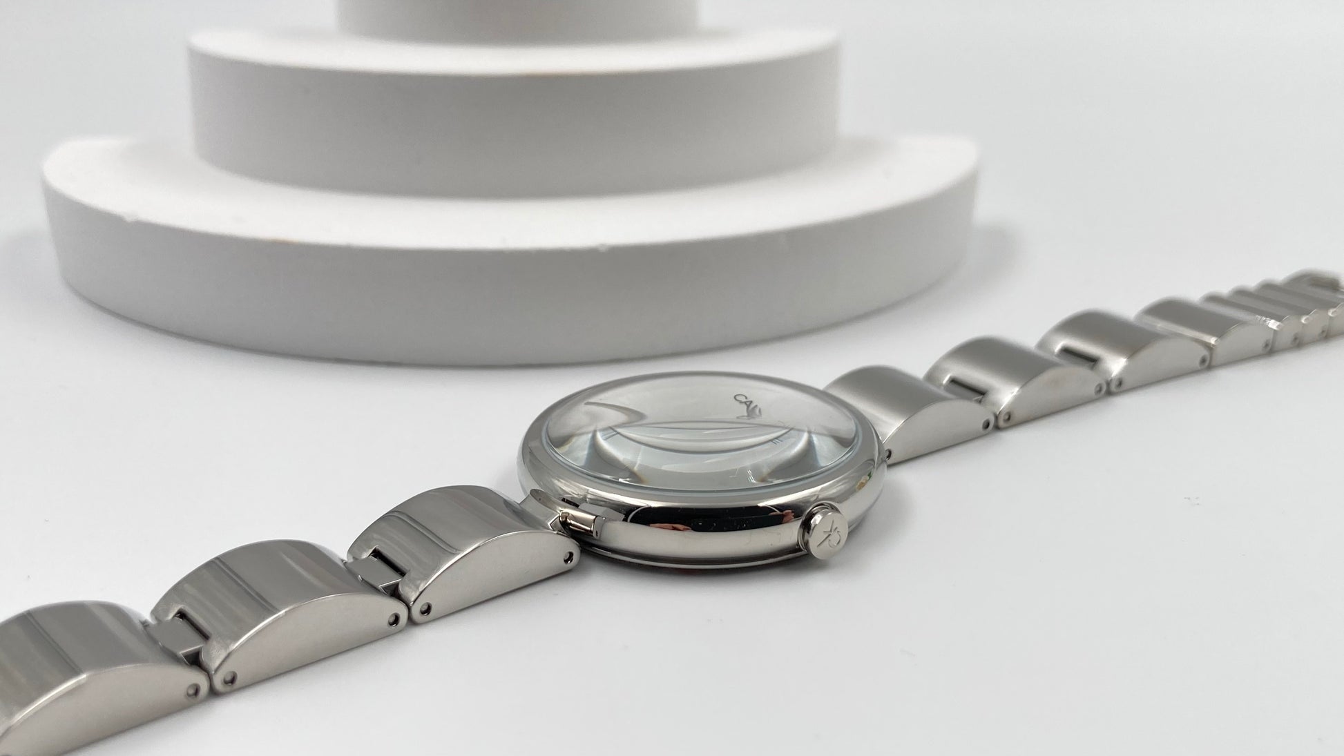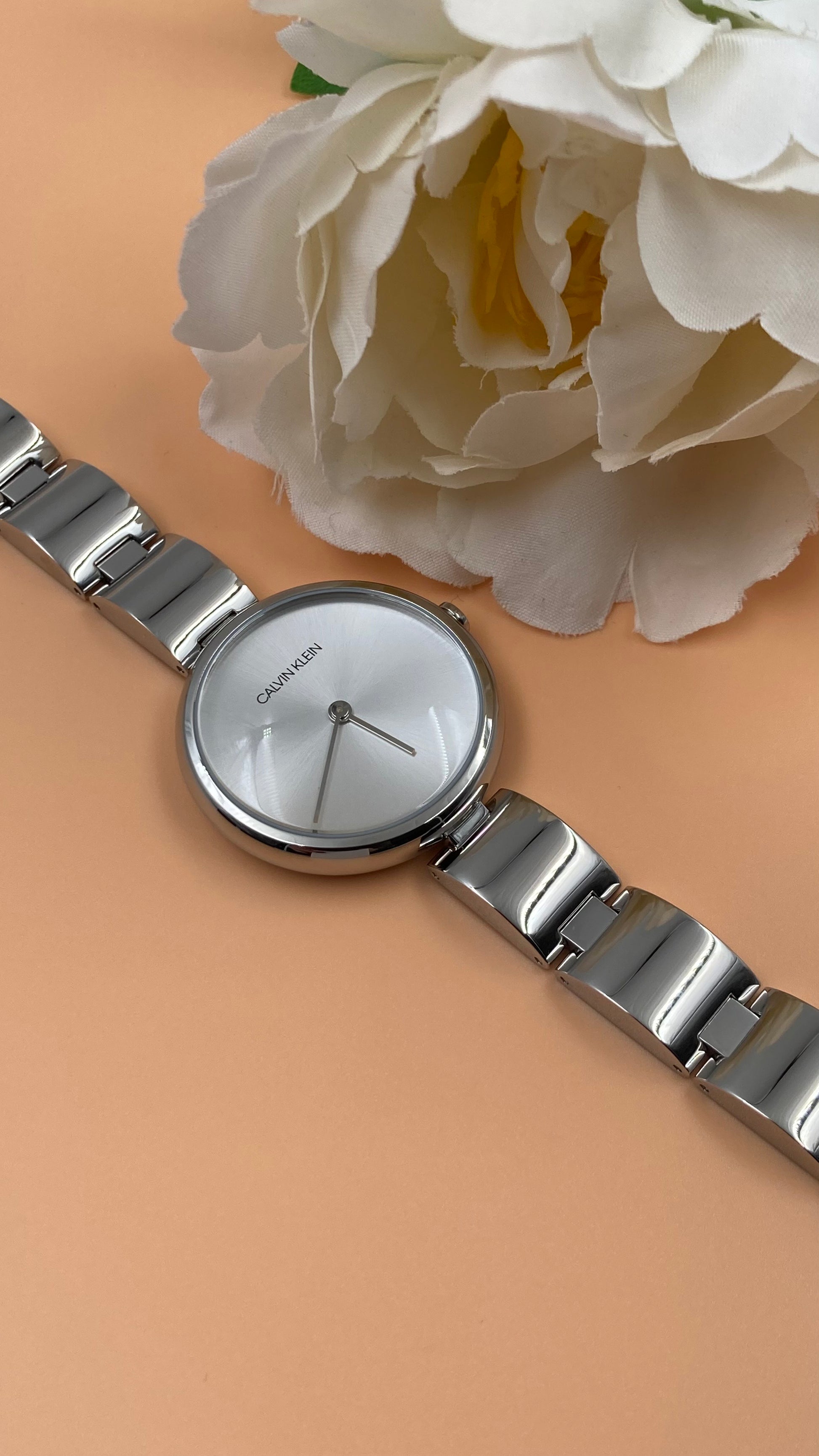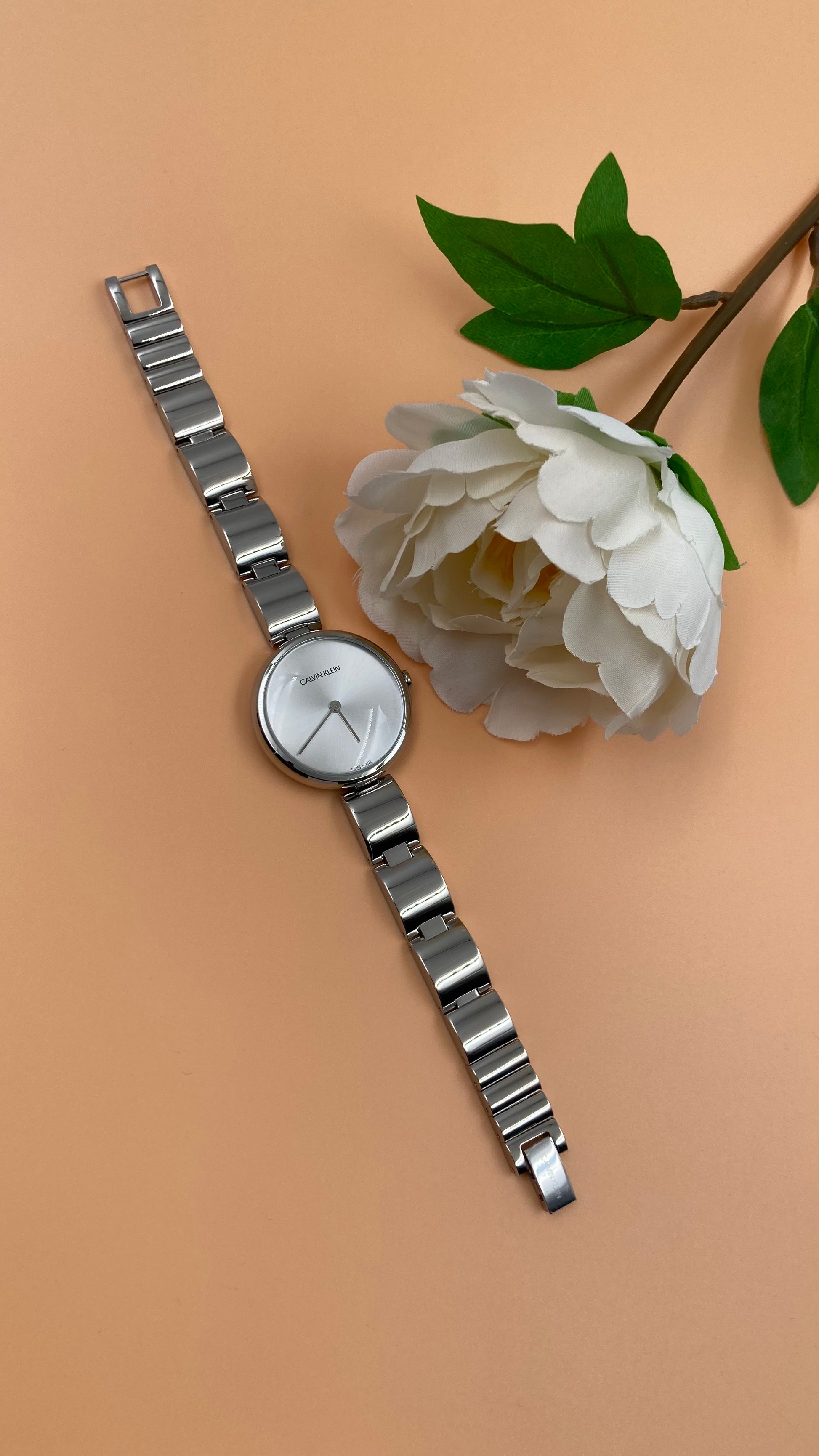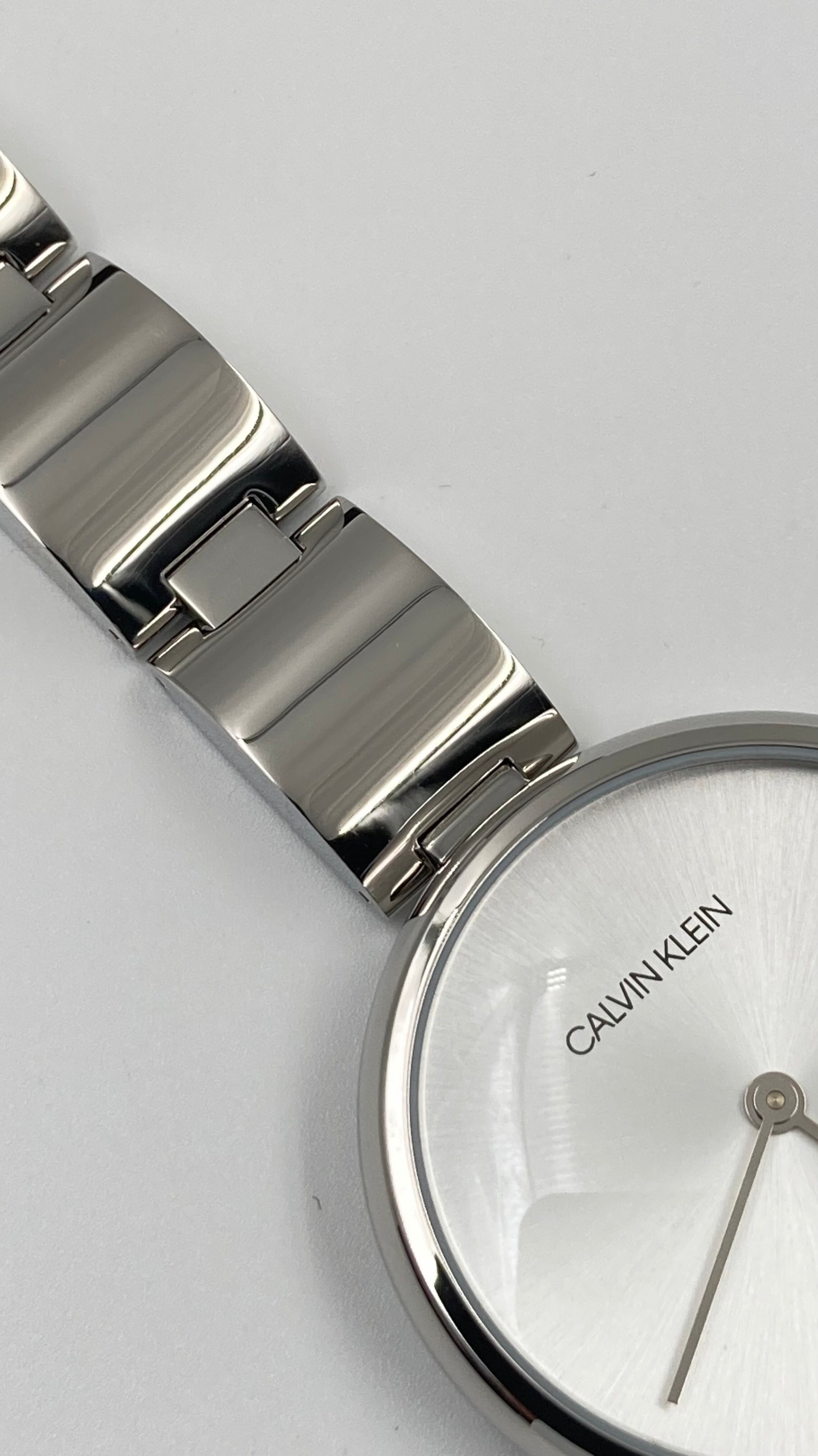 Neue, in der Schweiz hergestellte CALVIN KLEIN-Damenuhr mit gewelltem Quarzwerk und silbernem Zifferblatt
