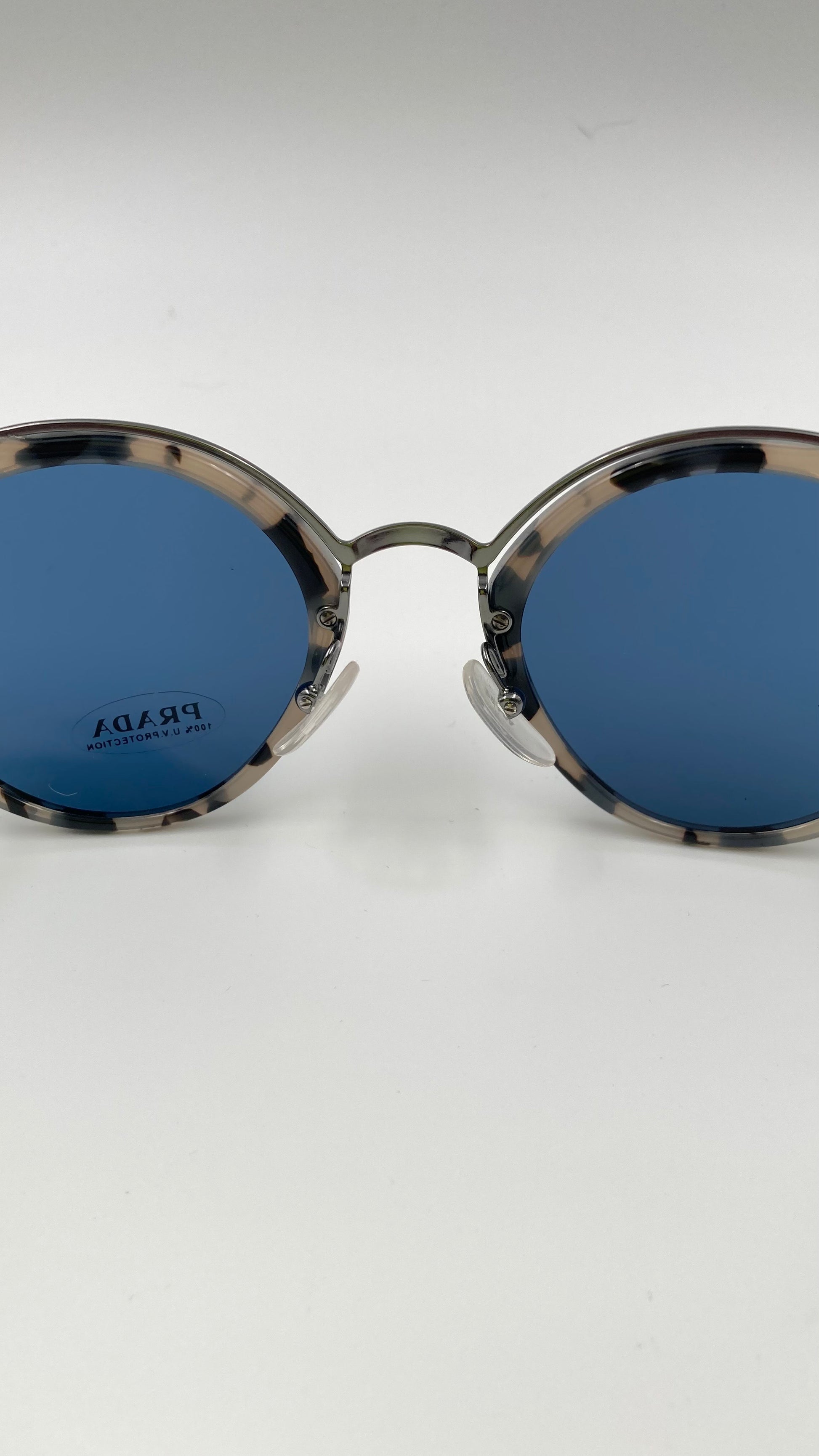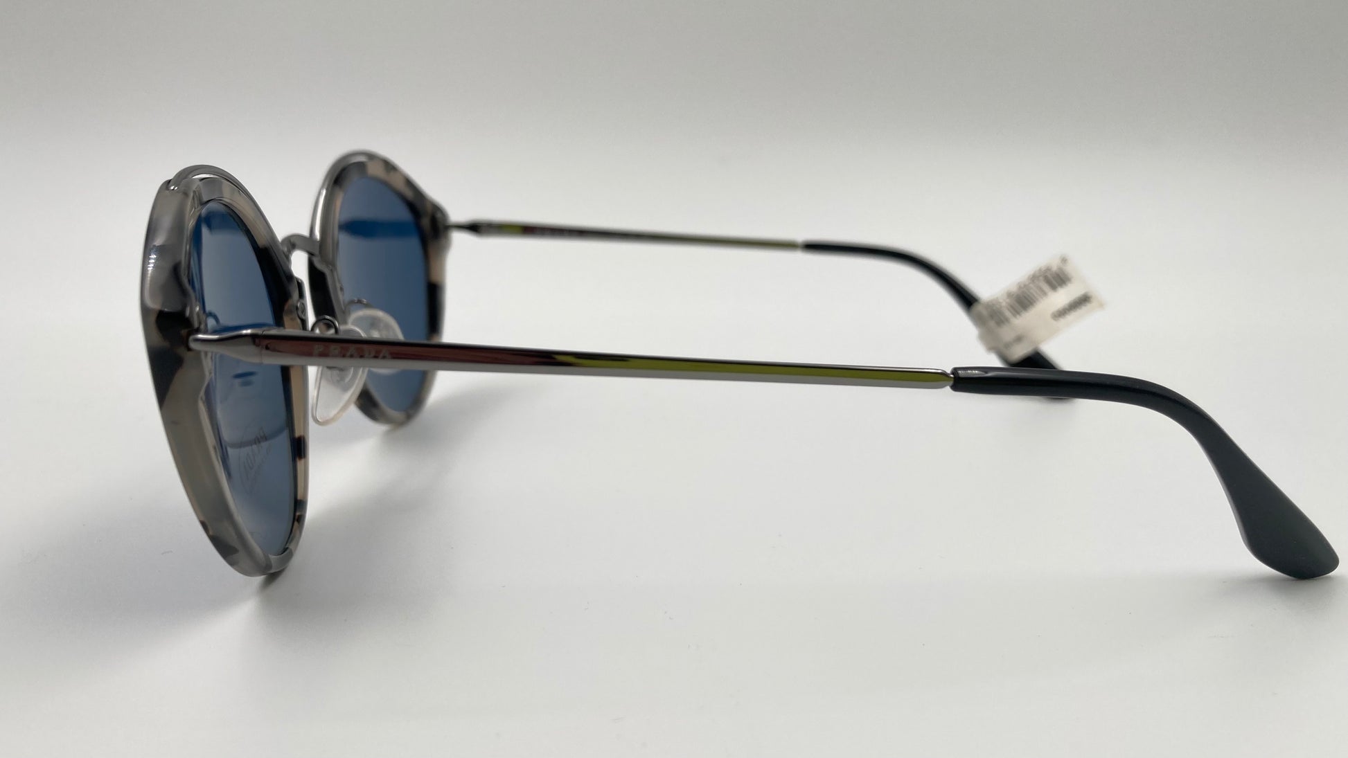 Stylish PRADA Conceptual sunglasses with grey Havana frame and cool blue shade lens.