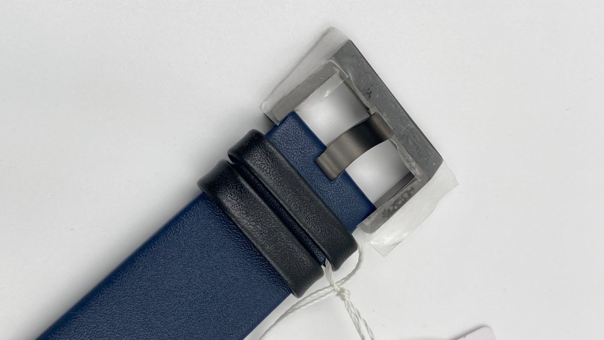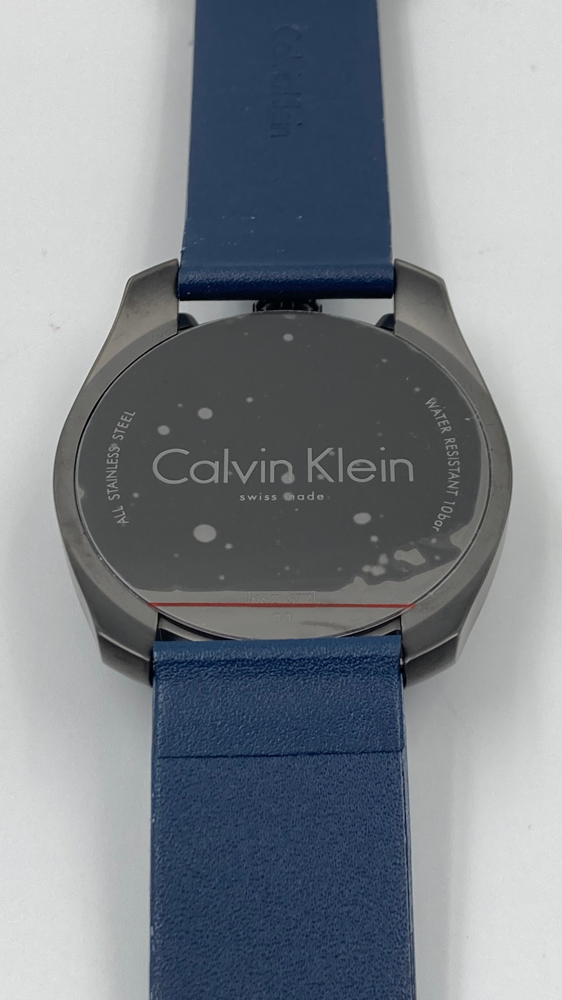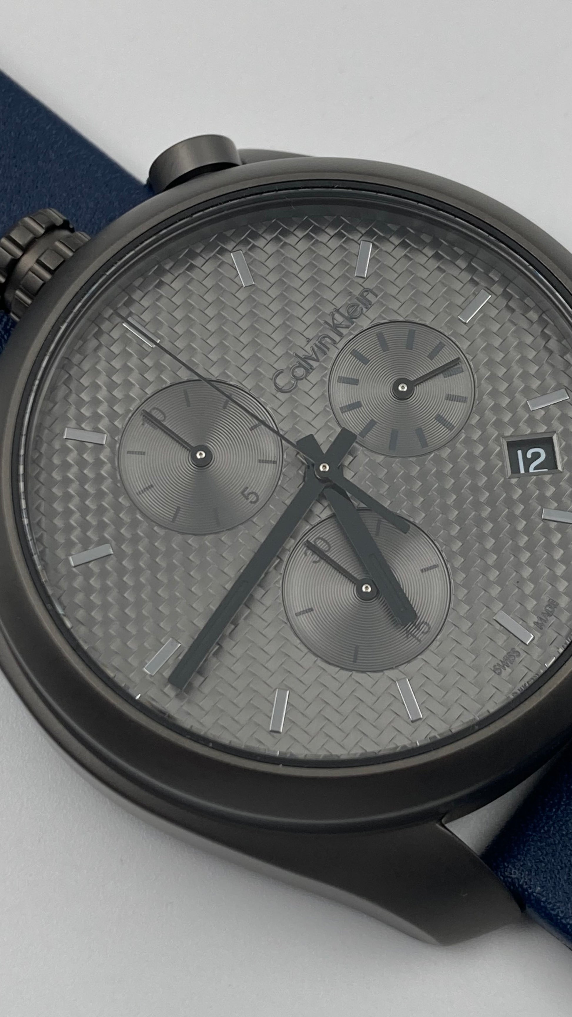 Grey PVD stainless steel case with a blue leather strap. Fixed grey PVD bezel. Grey carbon fiber dial with black hands and index hour markers. Dial Type: Analog. ETA G10.212. Luminescent hands and markers. Date display between the 4 and 5 o'clock positions. Chronograph - three sub-dials displaying: 60 second, 30 minute and 1/10th of a second. Quartz movement. Scratch resistant mineral glass. Pull / push crown. Solid case back. Round case shape. Case size: 44 mm. Case thickness: 12 mm. Band width: 22 mm. Band length: 8 inches. Tang clasp. Water resistant at 100 meters / 330 feet. Functions: chronograph, date, hour, minute, second. Sport watch style. Watch label: Swiss Made. Calvin Klein Control Chronograph Grey Dial Men's Watch K6Z577V4. Item comes in Original Calvin Klein Box. MADE IN SWITZERLAND.
