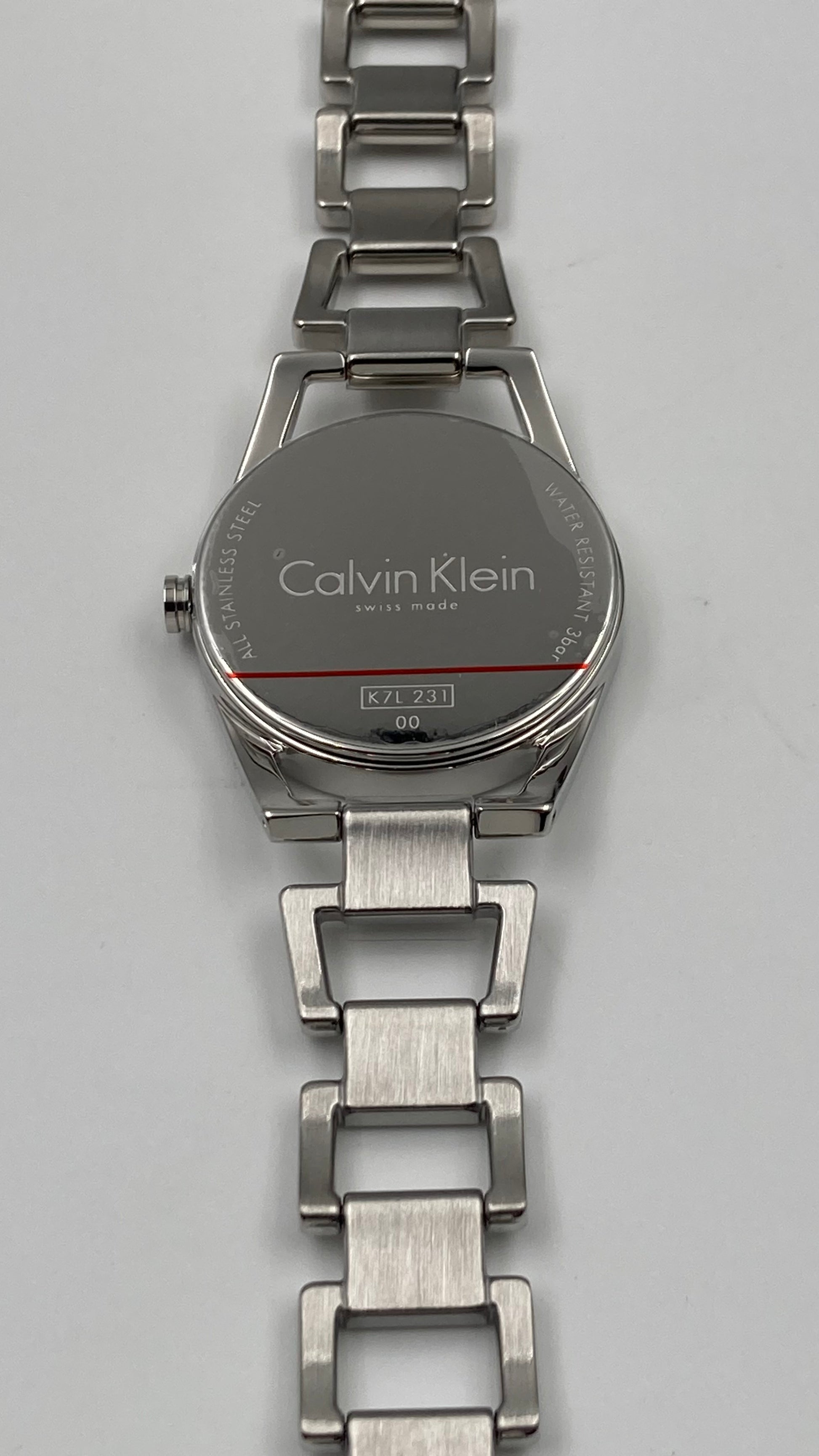 Stainless steel case with a silver-tone stainless steel bangle bracelet. Fixed silver-tone stainless steel bezel. Black dial with silver-tone hands. Index markers at the 3, 6, 9 and 12 o'clock positions. Dial Type: Analog. ETA caliber 901.001 quartz movement. Scratch resistant mineral glass. Pull / push crown. Solid case back. Round case shape. Case size: 30 mm. Case thickness: 7 mm. Band width: 16 mm. Jewelry clasp. Water resistant at 30 meters / 100 feet. Functions: hour, minute. Casual watch style. Watch label: Swiss Made. Calvin Klein Dainty Quartz Black Dial Ladies Watch K7L23141. MADE IN SWITZERLAND.