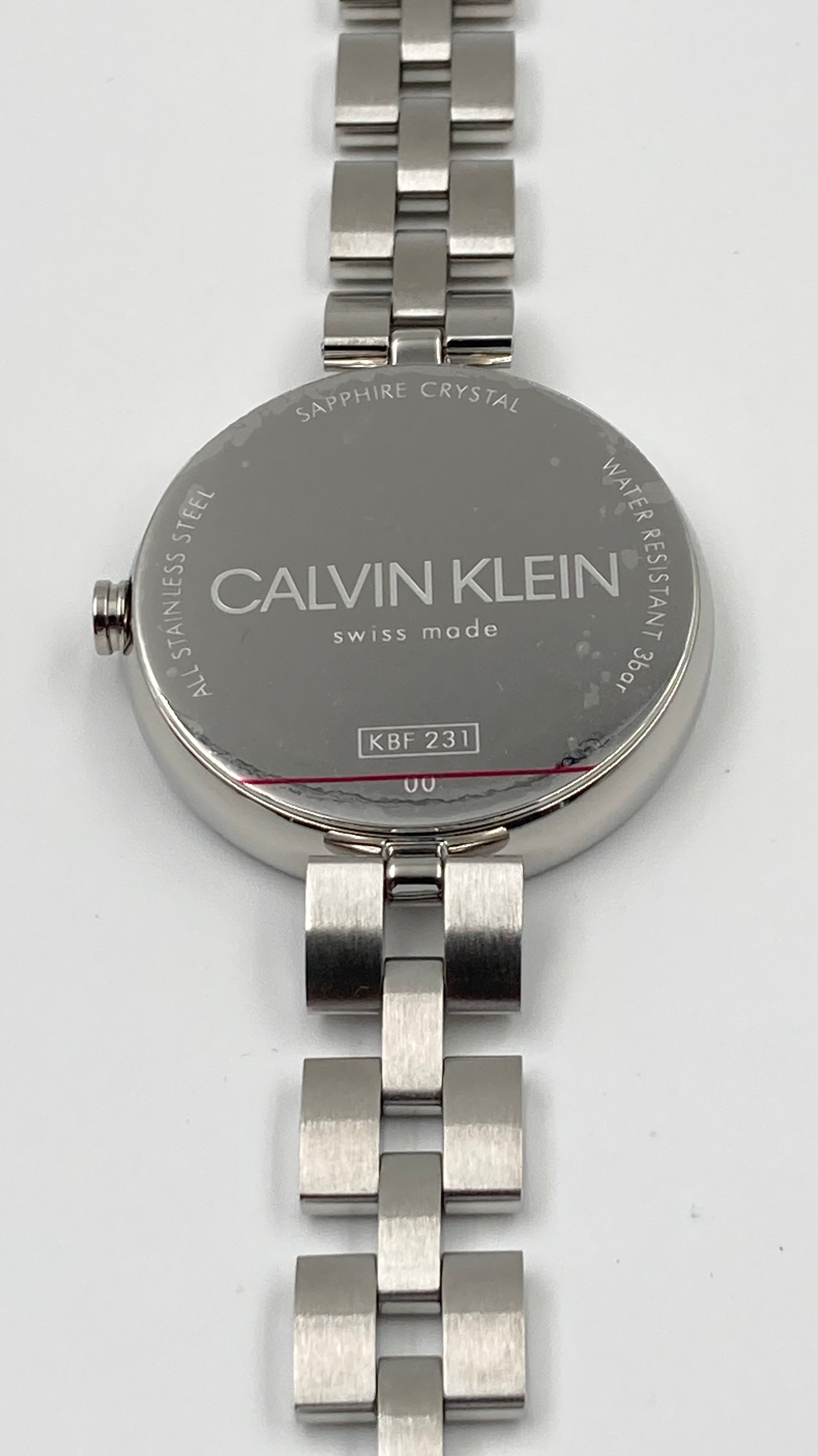 Stainless steel case with a stainless steel bracelet. Fixed stainless steel bezel. Silver dial with silver-tone hands. Index markers at the 3, 6, 9 and 12 o'clock positions. Dial Type: Analog. ETA caliber 901.001 quartz movement. Scratch resistant sapphire glass. Pull / push crown. Solid case back. Round case shape. Case size: 32 mm. Case thickness: 6 mm. Band width: 11 mm. Jewelry clasp. Water resistant at 30 meters / 100 feet. Functions: hour, minute. Elegance Series. Casual watch style. Watch label: Swiss Made. Calvin Klein Elegance Quartz Silver Dial Ladies Watch KBF23146. MADE IN SWITZERLAND.