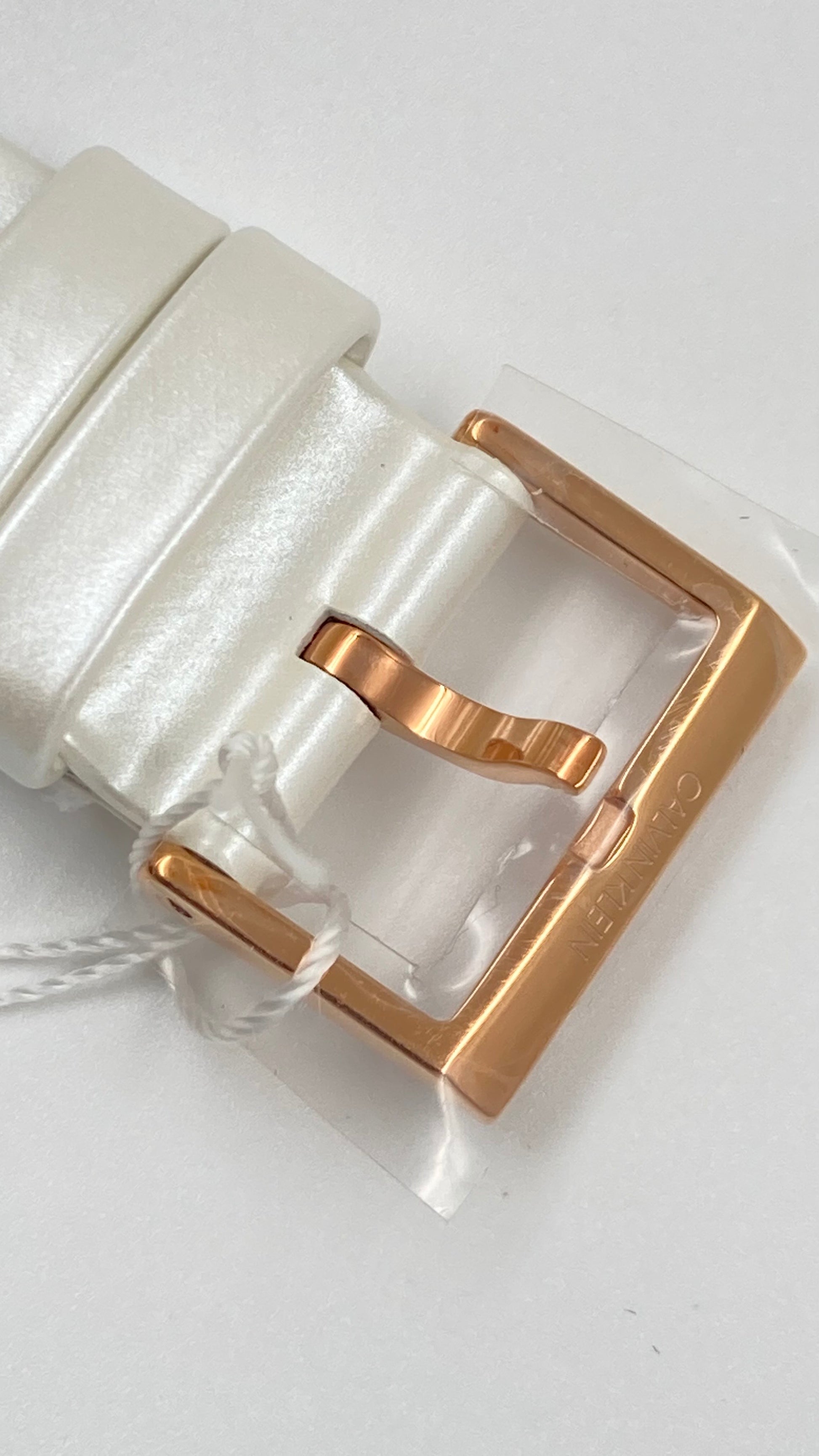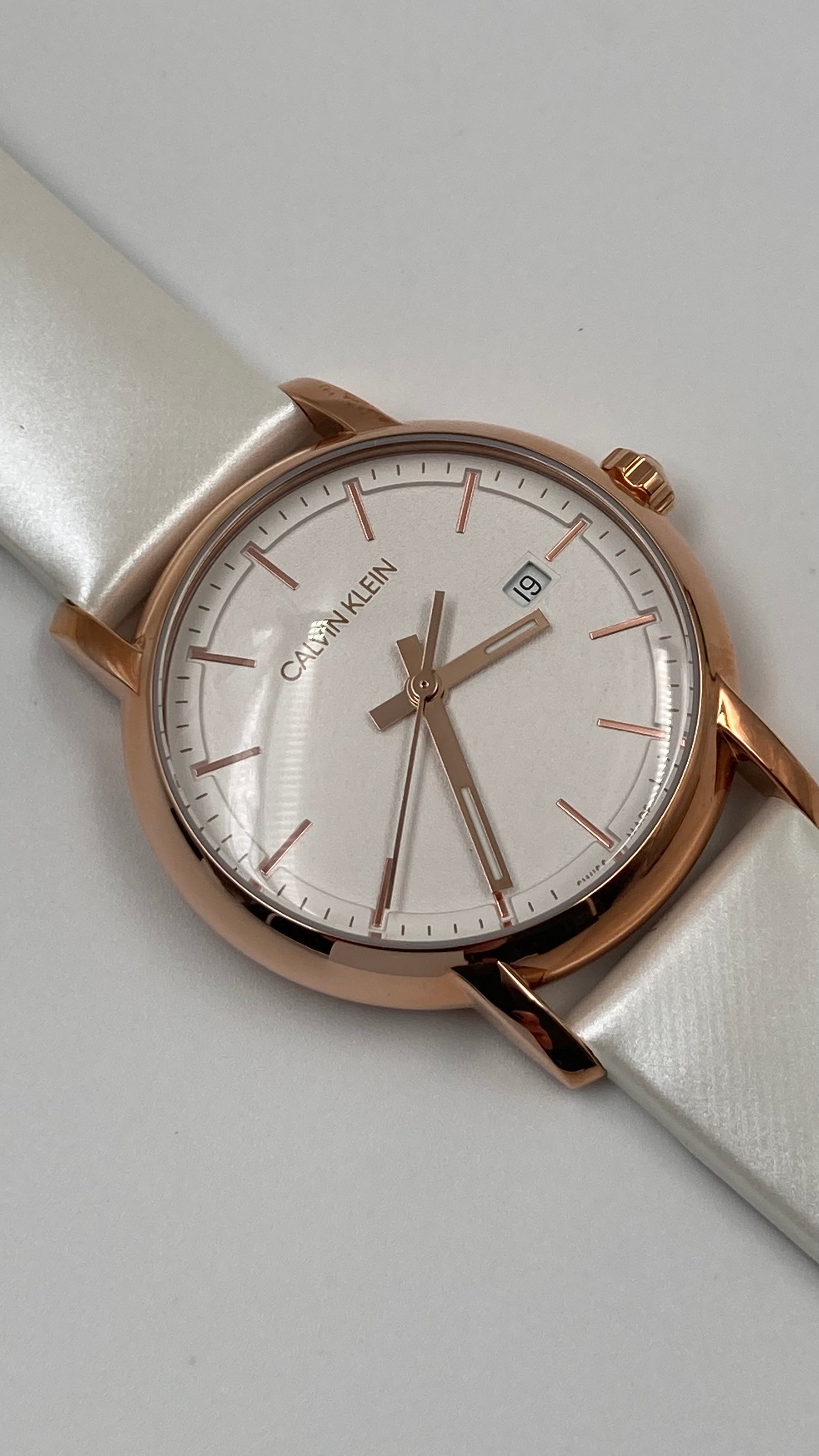 Rose gold PVD stainless steel case with a white leather strap. Fixed rose gold PVD bezel. Silver dial with luminous rose gold-tone hands and index hour markers. Minute markers around the outer rim. Dial Type: Analog. Luminescent hands. Date display at the 3 o'clock position. ETA F04.111. Quartz movement. Scratch resistant mineral glass. Pull / push crown. Solid case back. Round case shape. Case size: 32 mm. Case thickness: 8 mm. Band width: 16 mm. Tang clasp. Water resistant at 30 meters / 100 feet. Functions: date, hour, minute, second. Established Series. Casual watch style. Calvin Klein Established Quartz Silver Dial Ladies Watch K9H236L6. Item comes in Original Calvin Klein Box. MADE IN SWITZERLAND