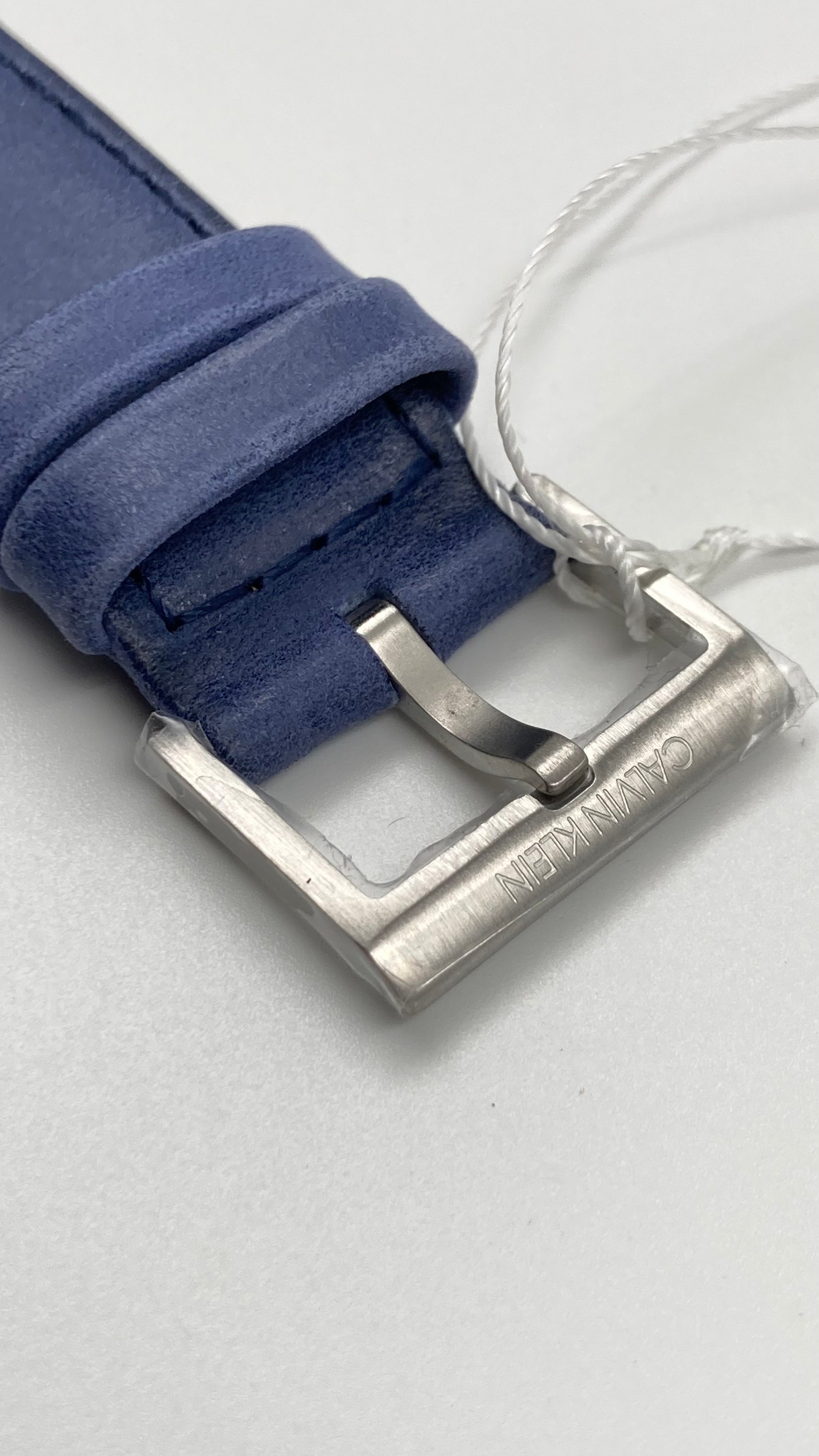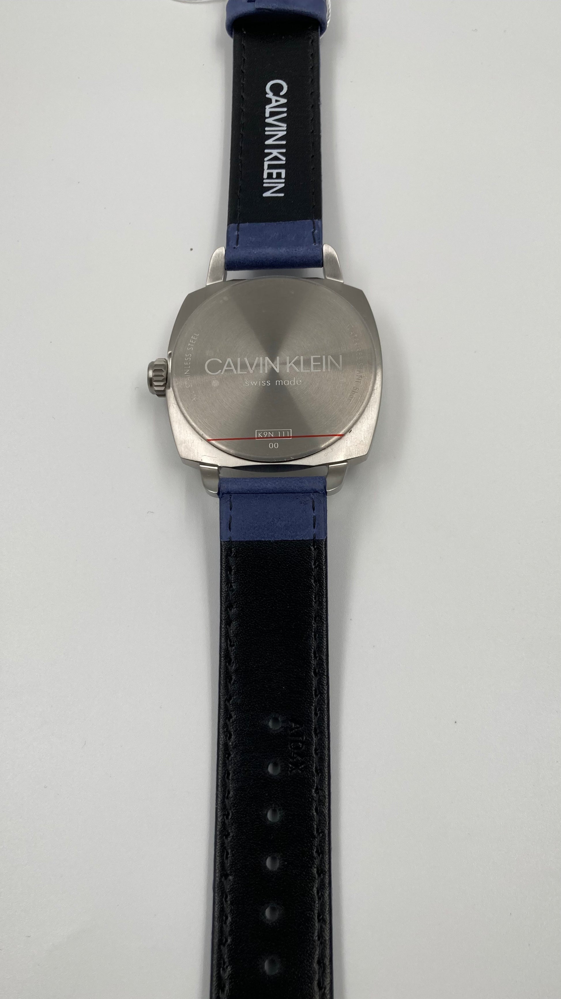 Stainless steel case with a blue leather strap. Fixed stainless steel bezel. Blue dial with luminous silver-tone hands and index hour markers. Minute markers around the outer rim. Dial Type: Analog. Luminescent hands and markers. Date display at the 3 o'clock position. ETA F06.111. Quartz movement. Scratch resistant mineral glass. Pull / push crown. Solid case back. Cushion case shape. Case size: 38.70 mm. Case thickness: 11 mm. Band width: 18 mm. Tang clasp. Water resistant at 5 ATM (50 meters) Functions: date, hour, minute, second. Fraternity Series. Casual watch style. Watch label: Swiss Made. Calvin Klein Fraternity Quartz Blue Dial Men's Watch K9N111VN. Item comes in Original Calvin Klein Box. MADE IN SWITZERLAND.