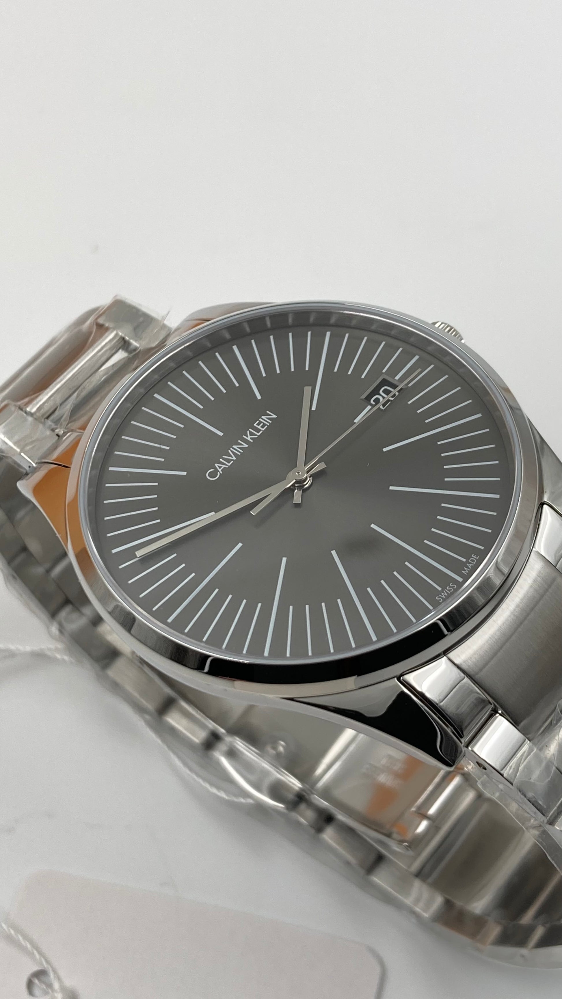 Silver-tone stainless steel case and bracelet. Fixed silver-tone stainless steel bezel. Grey dial with silver-tone hands and index hour markers. Minute markers around the outer rim. Dial Type: Analog. Date display at the 3 o'clock position. Quartz movement. Scratch resistant sapphire crystal. Pull / push crown. Solid case back. Round case shape, case size: 40 mm. Band width: 22 mm. Fold over clasp with a safety release. Water resistant at 30 meters / 100 feet. Functions: date, hour, minute, second. Casual watch style. Watch label: Swiss Made. Calvin Klein Quartz Grey Dial Men's Watch K4N21143. MADE IN SWITZERLAND.
