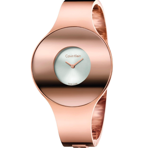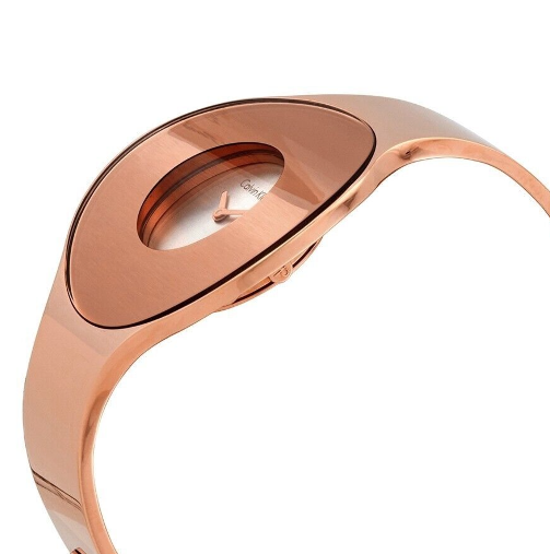 New Swiss Made CALVIN KLEIN Seamless Bangle Small Ladies Quartz Watch Rose Gold. Rose gold PVD stainless steel case and bracelet. Fixed rose gold PVD bezel. Silver dial with rose gold-tone hands. No markers. Dial Type: Analog. ETA 901.001. Quartz movement. Scratch resistant mineral glass. Pull / push crown. Solid case back. Round case shape. Case size: 21.10 mm. Case thickness: 10 mm. Jewellery clasp. Water resistant at 30 meters / 100 feet. Functions: hour, minute. Casual watch style. Watch label: Swiss Made. Calvin Klein Seamless Silver Dial Ladies Small Rose Gold PVD Bangle Watch K8C2S616. MEASUREMENTS - Bracelet Inner Width - 5.2 cm. Bracelet Inner Height - 3.7 cm. Inner Circumference - 14 cm. Item comes in original Calvin Klein box. Please check measurements for the correct size when ordering. MADE IN SWITZERLAND.