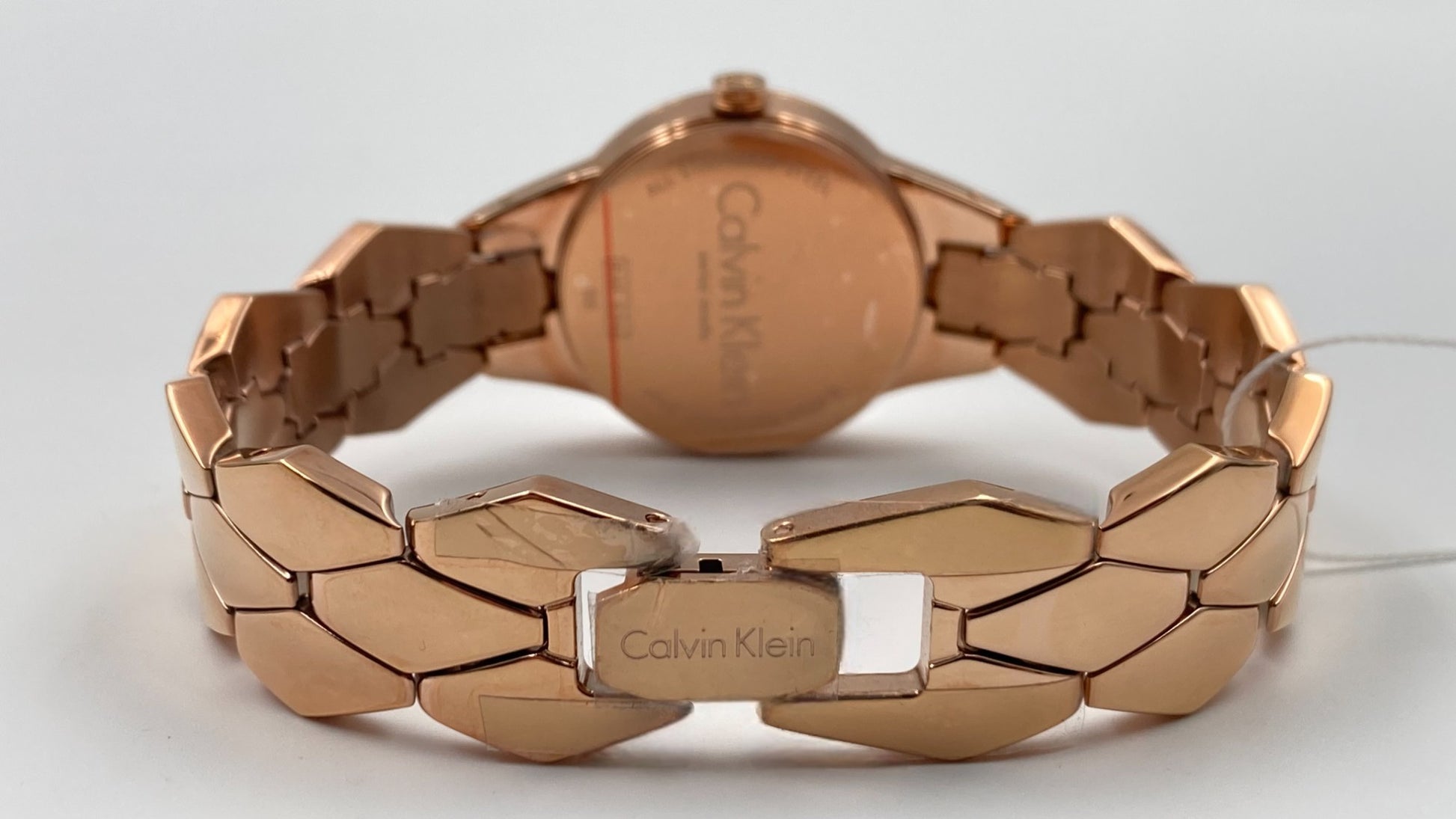 Rose gold PVD stainless steel case and bracelet. Fixed rose gold PVD bezel. Silver dial with rose gold-tone hands. No markers. Dial Type: Analog. ETA 901.001. Quartz movement. Scratch resistant mineral glass. Pull / push crown. Solid case back. Round case shape. Case size: 28 mm. Case thickness: 8 mm. Band width: 16 mm. Jewelry clasp. Water resistant at 30 meters / 100 feet. Functions: hour, minute. Casual watch style. Watch label: Swiss Made. Calvin Klein Snake Quartz Silver Dial Ladies Watch K6E23646. MADE IN SWITZERLAND.