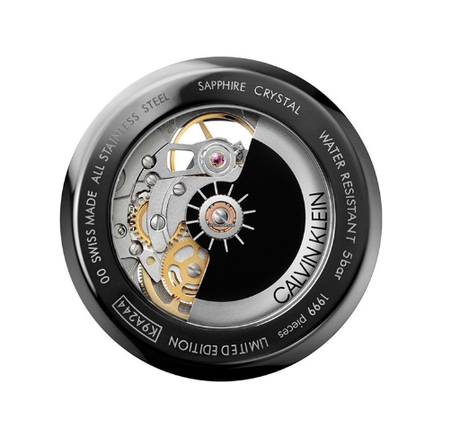 Black PVD stainless steel case with a black leather strap. Fixed black PVD stainless steel bezel. Black (skeleton center) dial with silver-tone hands and index hour markers. Dial Type: Analog. Luminescent hands. Automatic movement. Scratch resistant sapphire crystal. Pull / push crown. Transparent case back. Round case shape, case size: 40 mm. Band width: 20 mm. Fold over clasp with a push button release. Water resistant at 50 meters / 165 feet. Functions: hour, minute, second. Swing Series. Casual watch style. Watch label: Swiss Made. Calvin Klein Swing Automatic Men's Watch K9A244CY. MADE IN SWITZERLAND.